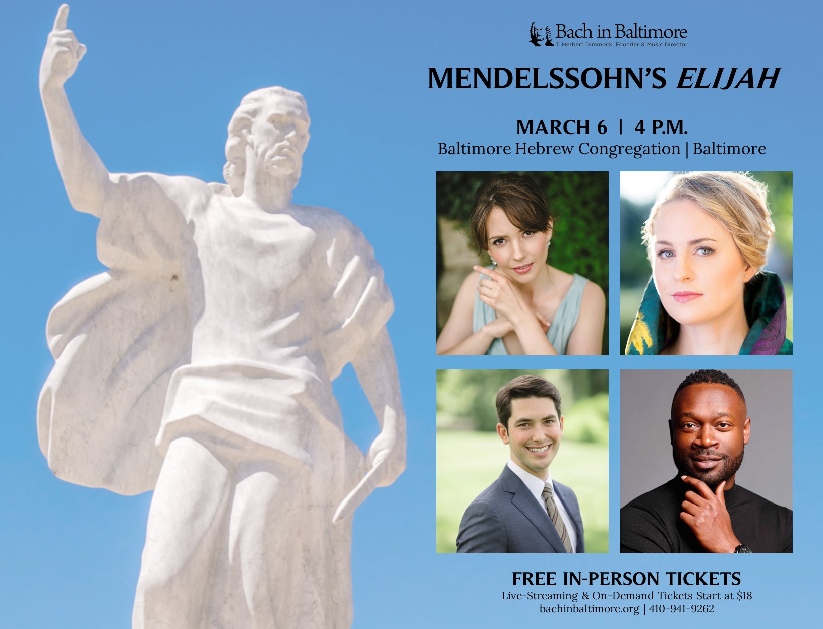 Under the direction of T. Herbert Dimmock, four talented soloists–Elissa Edwards, Soprano; Kristen Dubenion-Smith, Alto; Ben Ellerin, Tenor; and Carl DuPont, Bass–the full Bach in Baltimore Choir & Orchestra bring the Hebrew Biblical story of the prophet Elijah to life. Elijah, Mendelssohn’s most famous oratorio, was heavily inspired by the cantatas of J.S. Bach. Mendelssohn’s keen musicological recovery and revival efforts throughout the nineteenth century resurrected the music of J.S. Bach back into the public psyche. After Bach’s death, his music fell out of style and was relegated to music students and practice studios rather than in concert halls for public enjoyment. Mendelssohn famously brought Bach back into fashion with his knockout performance of the St. Matthew Passion. Mendelssohn’s Elijah is a thrilling, soaring work whose structure calls to mind the sacred music of Bach that so enthused and inspired him. Acclaimed from its first premiere in 1846, this Elijah alone has cemented Mendelssohn’s place in history as one of the greatest composers of sacred music. This concert is free but tickets ARE still required for entrance.