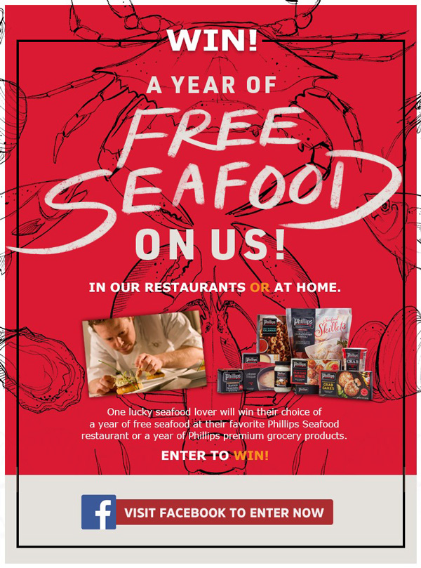 Phillips Seafood is excited to celebrate National Seafood Month by announcing a “Free Seafood for a Year” contest. It’s easy to enter. Log onto Phillips Seafood Facebook page anytime from October 1 through October 31, 2019 and enter.  One entry will be randomly selected to win their choice of a year free seafood or a year of Phillips premium grocery products. For your chance to win, click here Facebook.com/phillipsseafood.
