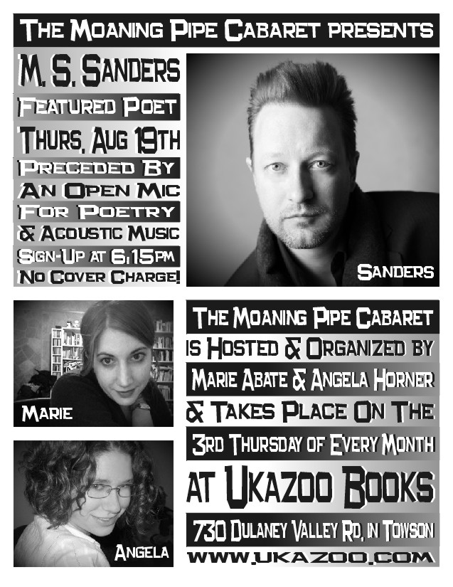 M. S. Sanders will be the featured poet for The Moaning Pipe Cabaret on Thursday, August 19, 2010. This monthly, featured performer & open mic music & literary event takes place on the 3rd Thursday of every month at Ukazoo Books on 730 Dulaney Valley Road, Towson, MD 21204. This event is preceded by an open mic for poetry and acoustic music. Sign-up for the open mic begins at 6:15 pm. This event is free and open to the public. Handicapped accessible.