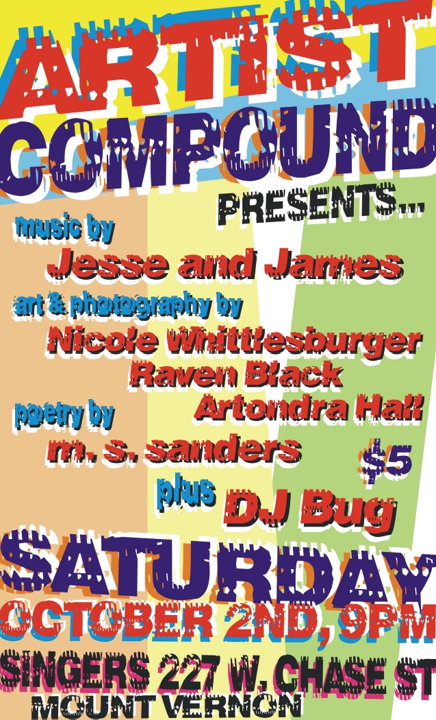 DJ Bug, Jesse & James, Artronda Hall, Raven Black, Nicole Whittlesburger and m. s. sanders will be the featured artists for Artist Compound at 9pm, Saturday, October 2, 2010. This recurring multimedia event is held at various venues in and around Baltimore City and this time takes place at Singer’s Bar & Restaurant in Mount Vernon, 227 West Chase Street. This event costs $5 at the door and is open to the public. Singer’s Bar & Restaurant is handicapped accessible.