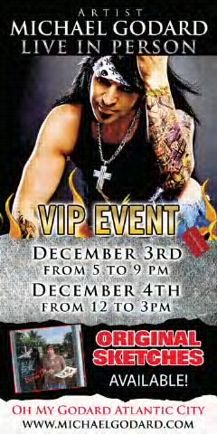 Just in time for the holiday season, “Rock Star of the Art World” Michael Godard, will return to the Oh My Godard Gallery at the Pier Shops at Caesars for a special in-store appearance on December 3th and 4th. This event is the perfect place to purchase one-of-a-kind gifts for art enthusiasts and Godard fans alike. At his holiday Atlantic City appearance, fans will be able to meet Godard, purchase original works and his top-selling book, Don’t Drink & Draw. The oversized, coffee-table book covers Godard’s journey from his troubled childhood to his life as a number one best-selling artist. Godard will sign and dedicate those books purchased as a special keepsake for fans. In addition to the book signing, Godard is available to work with collectors to create original sketches. Those interested in the opportunity to work with Godard to infuse an original idea with his traditional characters and style may purchase a blank canvas. The canvasses are available for preorder in three sizes and are priced from $2,500.00 to $4,500.00.