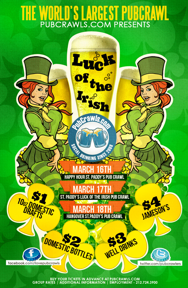 Once New Year's Eve is over, what's the next best holiday party? St. Patrick's Day of course! The green, the beer, and the....well, beer! It's the one time of the year when you have absolutely no excuse to stick to one bar the entire day - it's all about variety. Huntington has a phenomenal bar scene, and PubCrawls.com has scouted the area and decided that it's going to be the host of their next massive event! That's right folks, the producers of the World's Largest Pub Crawl are looking to do it all over again in Huntington! This is one experience that you'll definitely want to be a part of. This year there's no better place to be for St. Patrick's Day than at the Luck of the Irish Pub Crawl! PubCrawls.com has made history in the pasty, and this time around, they want you to be a part of it.