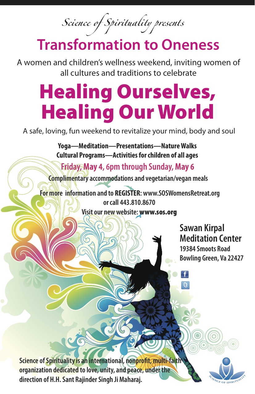 This women & children's retreat, sponsored by the Science of Spirituality (SOS), has become an annual tradition at the Sawan Kirpal Meditation Center in Bowling Green, VA. The past 2 years have been great successes and this year promises to be fabulous as well! Four different programs (divided by age groups) run throughout the weekend all focusing on how we can transform ourselves so that we can recognize our unity with each other and with God. This year we will be focusing on how healing ourselves, can help us in that transformation.