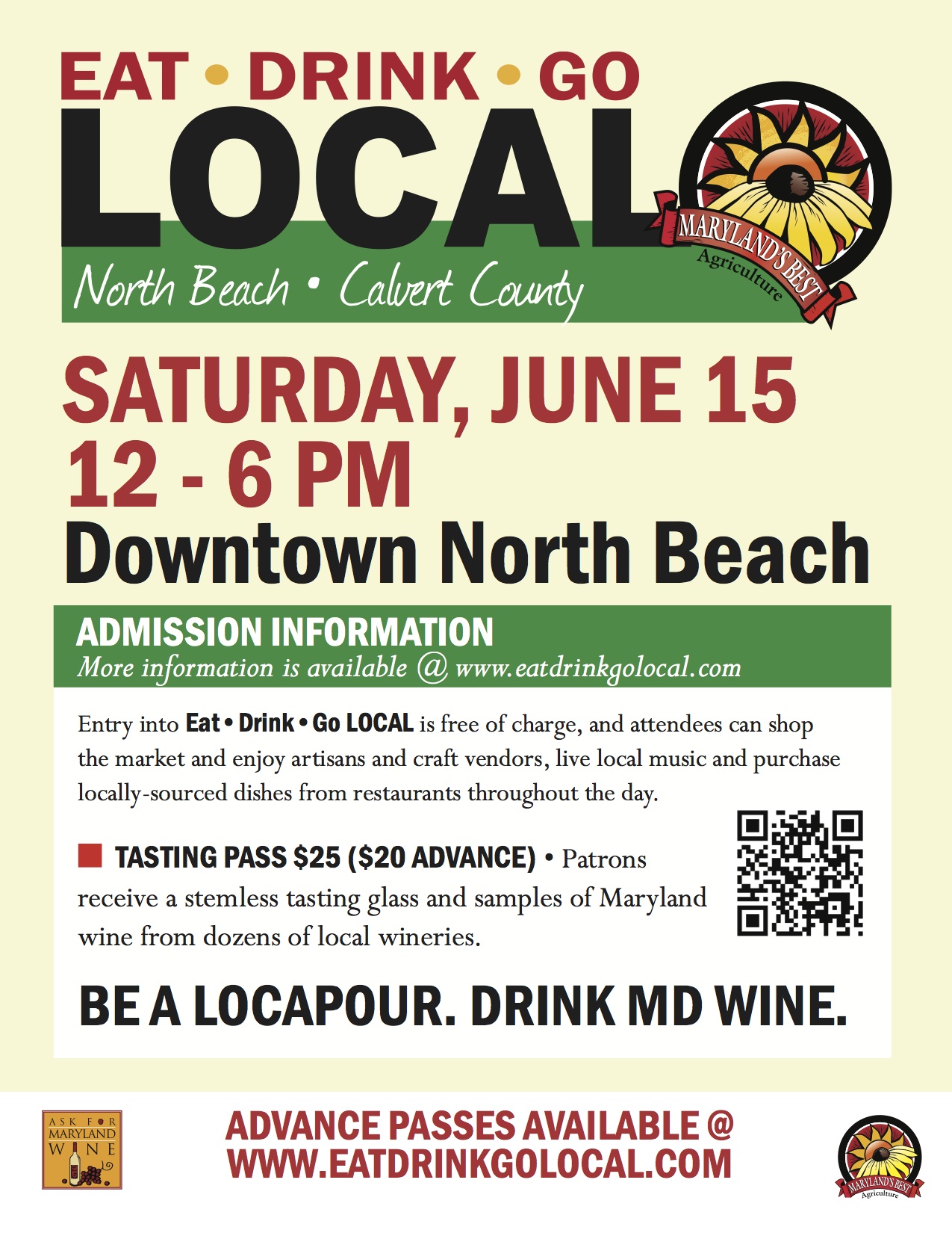 Join us for the third annual Eat•Drink•Go LOCAL North Beach--the premier local food and wine event in Southern Maryland with an open air Farmers Market feel. Browse local produce from regional farmers, handmade crafts and enjoy live music -- all the while learning which local wines to pair with local fare.