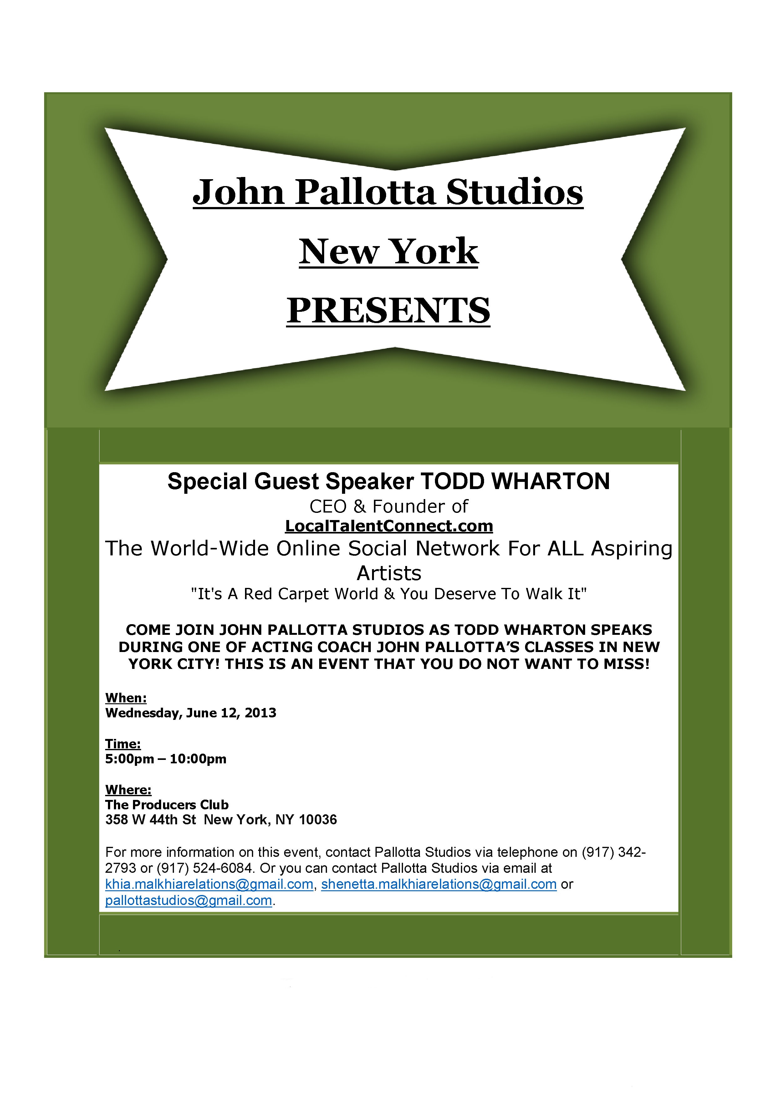 COME JOIN JOHN PALLOTTA STUDIOS AS TODD WHARTON SPEAKS DURING ONE OF ACTING COACH JOHN PALLOTTA’S CLASSES IN NEW YORK CITY! THIS IS AN EVENT THAT YOU DO NOT WANT TO MISS!