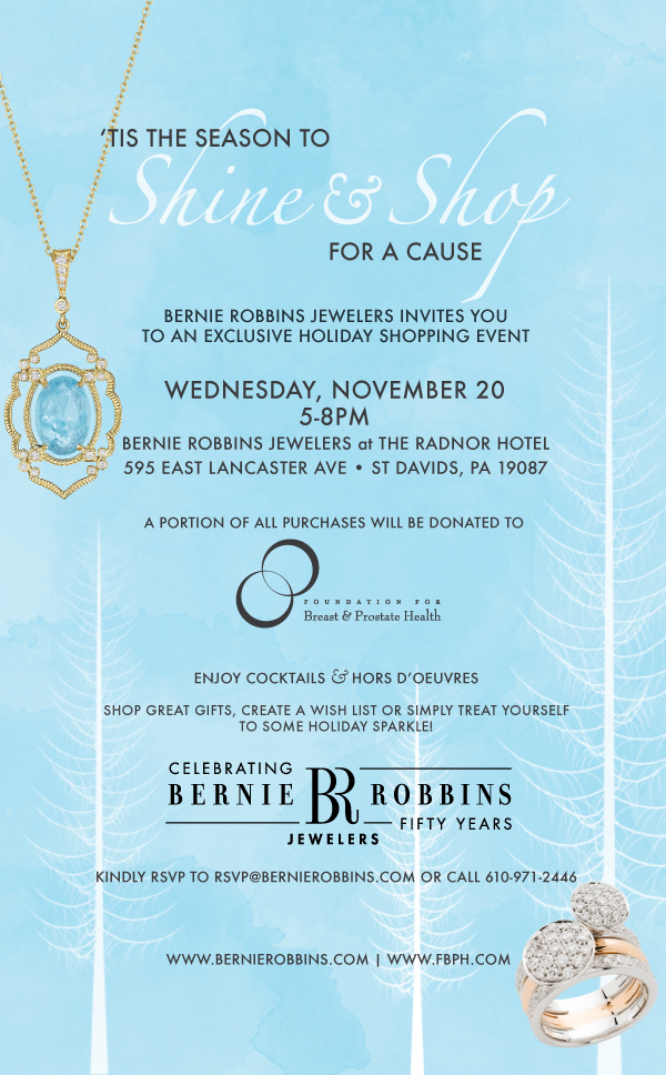 Start your holiday shopping off right and shine for a cause! As a leader in the jewelry industry, Bernie Robbins Jewelers is offering some of the most coveted pieces on the market this holiday season. Join us at this exclusive shopping event and create your own wish list, buy for a friend, or pamper yourself with the latest holiday sparkle! Enjoy complimentary cocktails and hors d’oeuvres while perusing amongst some of regions most prized jewels. A portion of all purchases will be donated to the Foundation of Breast and Prostate Health (FBPH), a non-profit organization dedicated to raising funds for clinical research, education and public awareness of breast and prostate cancer.