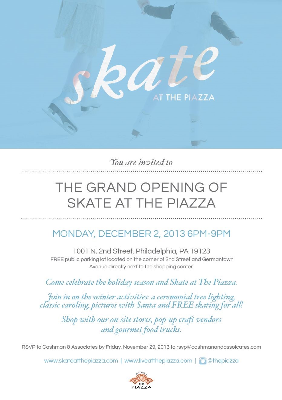 Come out, skate for free and enjoy the grand opening of Skate at The Piazza! This state of the art, environmentally-friendly pop-up ice skating rink is a must-visit winter destination that will occupy over 5,000 square feet at The Piazza. Join us for the opening celebration that will include a ribbon cutting, tree lighting, live performances, free skating for all, photo opportunities with Santa, food trucks, craft vendors, and more! Public parking lot located on the corner of 2nd Street and Germantown Avenue directly next to the shopping center.