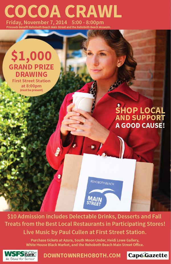Wine, Dine & Shop Local from 5-8:00 p.m.! Enjoy great deals, delectable drinks, art by Delaware artisans, desserts and fall treats from the best local restaurants - all inside participating stores! $10 admission benefits local charities.  Visit www.downtownrehoboth.com for more information or call 302.227.2772.