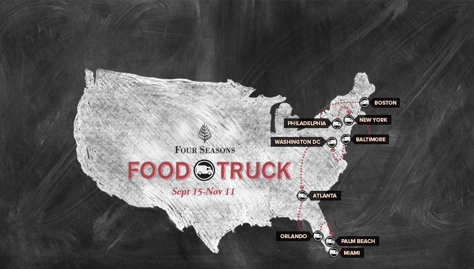 In an effort to create more awareness, build brand loyalty and down to earth grass-roots marketing, luxury hotel brand Four Seasons is taking their Chefs on the road. From September 15 to November 11, the Four Seasons Food Truck will make its way down the Eastern seaboard on a 43-day, 1,037-mile journey from Boston to Miami.