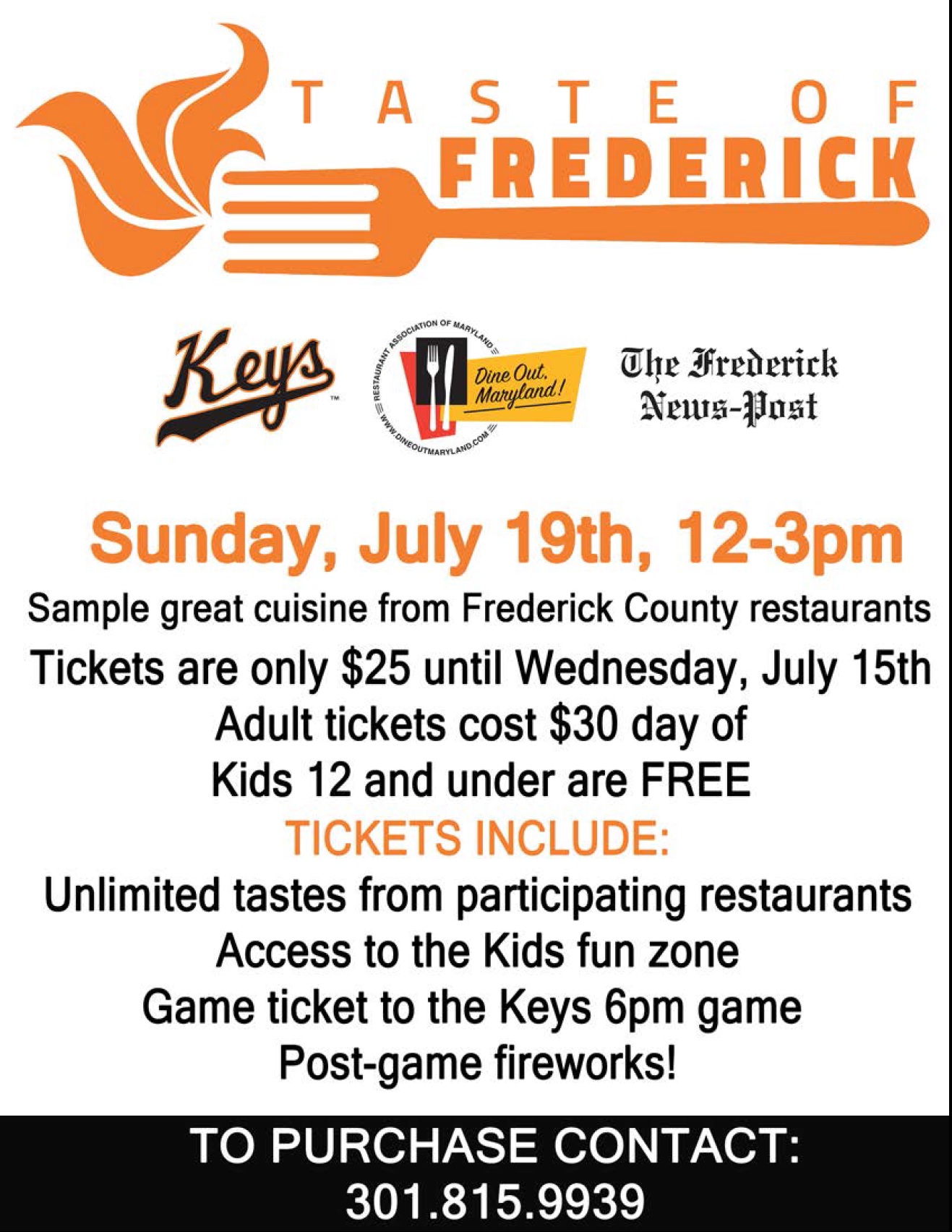 Advance tickets can be purchased for just $25. Kids 12 & under are FREE. Ticket price includes unlimited signatures tastes from every restaurant, kids’ fun zone, a Frederick Keys baseball game against the Potomac Nationals and fireworks.
