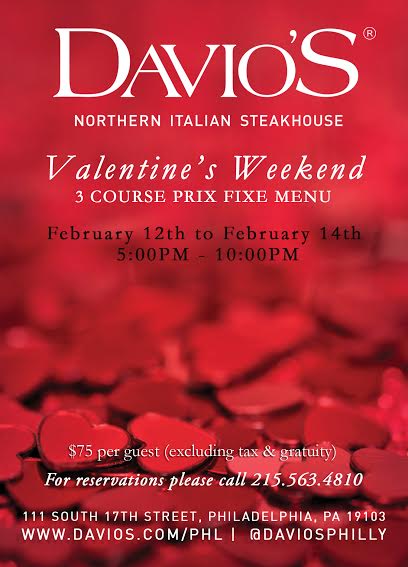 WHAT:            Bring your love to Davio's Northern Italian Steakhouse located in Philadelphia, PA for a romantic rendezvous this Valentine’s Day. In addition to the regular dinner menu, Davio’s is offering a special four-course prix-fixe menu including items such as the 16 oz. Brandt Beef T-Bone Steak, Farro Stuffed Long Hot Pepper, Impastata Ricotta, Citrus Basil Oil and Baked Lemon Sole, Prawns, Spinach Risotto, Sundried Tomato, Anchovy Butter. The menu will be available Friday, February 12th – Sunday, February 14th, 2016 for $75 per person (tax and gratuity not included). Reservations are recommended and can be made by calling 215.563.4810.