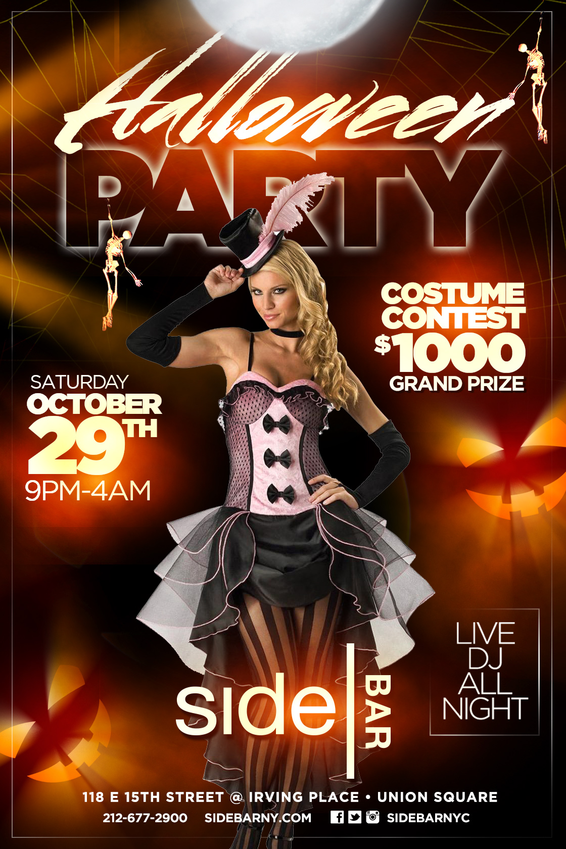 Join us at SideBAR on Saturday, 10/29 for the best costume party in Union Square! We have Live DJs, drink specials & A $1000 CASH GRAND PRIZE for the best costume!  For more information, please contact us at info@sidebarny.com