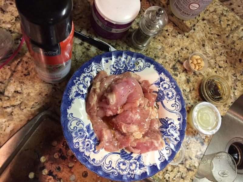 The following pictorial describes my cooking experience of Thai Grilled Chicken Thigh Salad that I prepared, plated and devoured the meal (seen in the photo) were some of the freshest chicken thighs that I have ever tasted. Fast! The process, took 25 mins, under 30 minutes is the goal. The directions are simple to follow.
