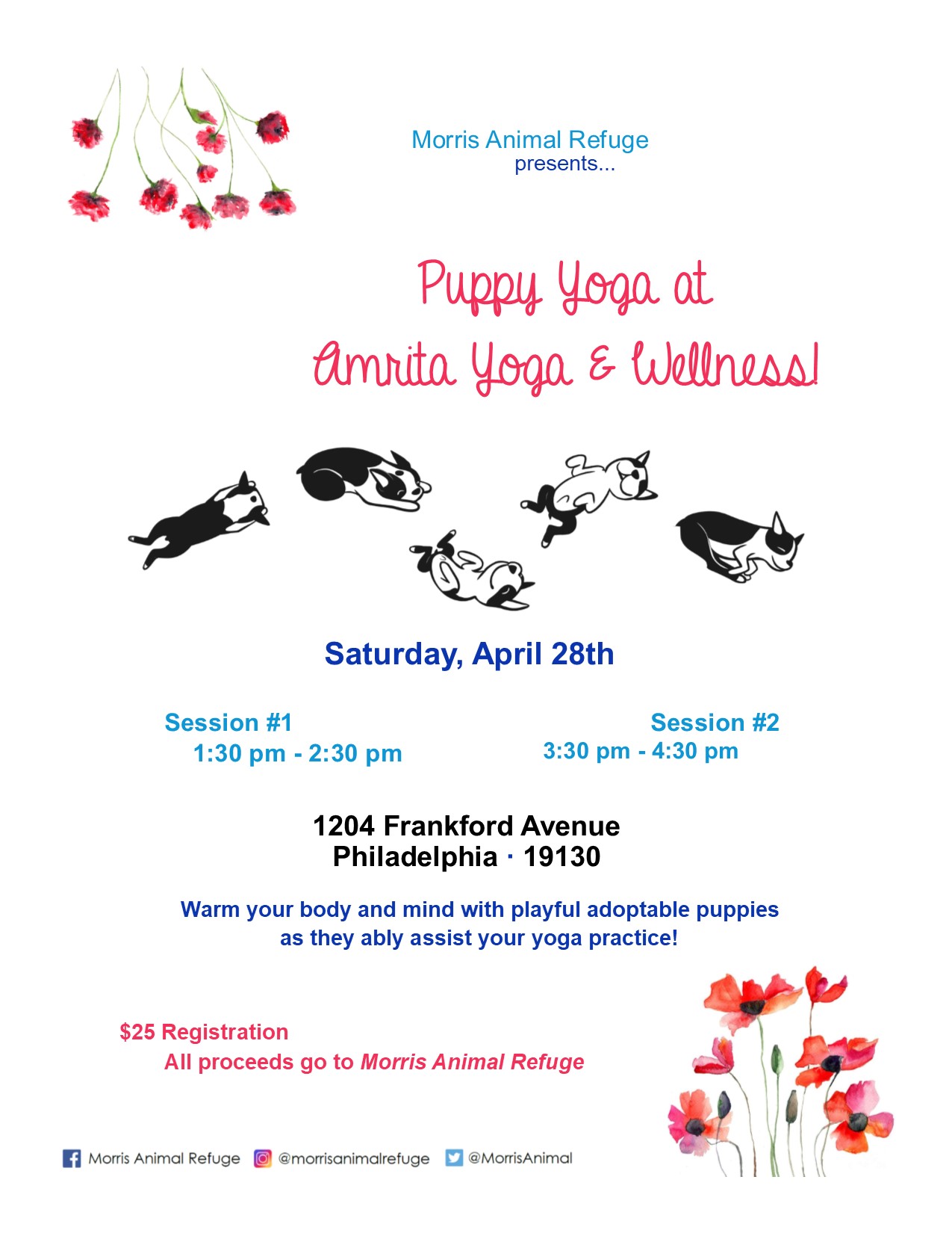 Get your tickets here: https://www.eventbrite.com/e/puppy-yoga-with-morris-animal-refuge-and-amrita-yoga-wellness-tickets-44777370320