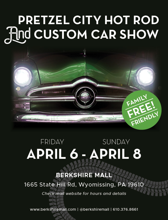 Pretzel City Rod & Custom Car Show comes to the Berkshire Mall on Friday April 6th until Sunday April 8th. Stop by to check out the hottest cards in town! The event is free and family friendly.