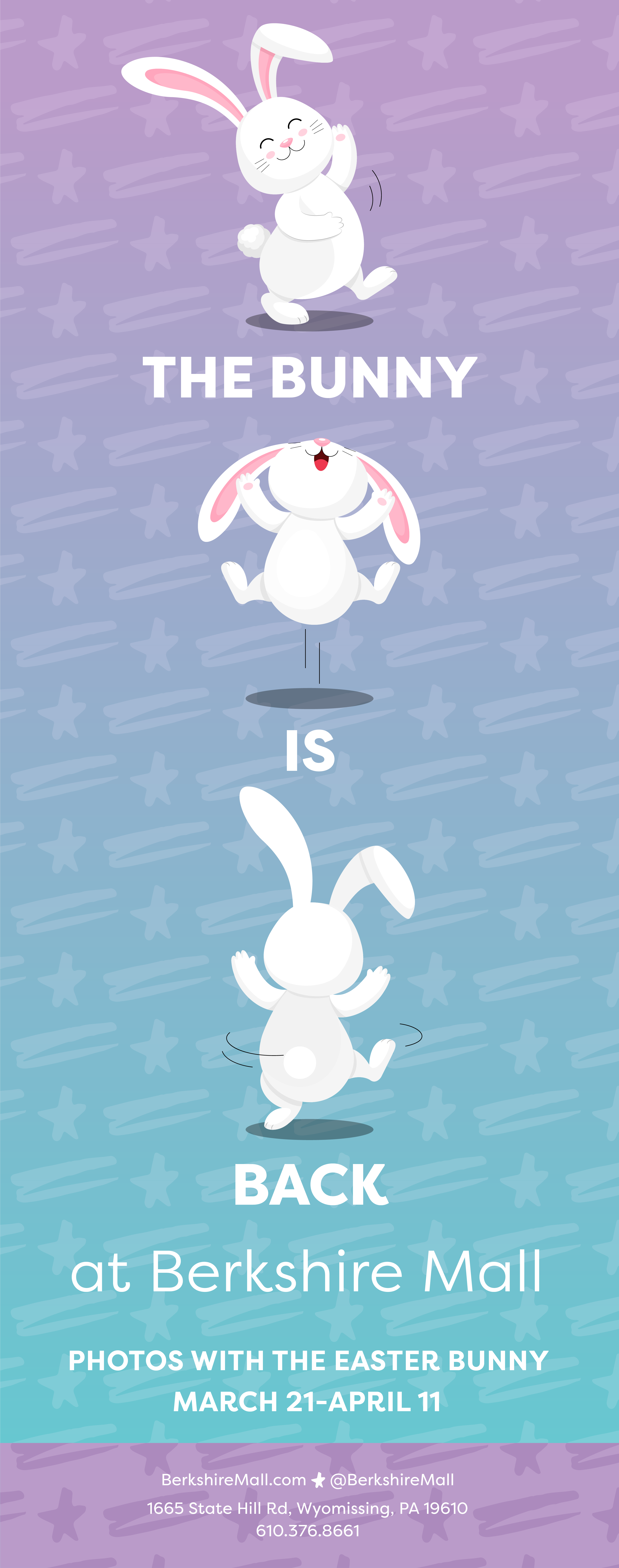 Welcome the Easter Bunny back to the Berkshire Mall this spring. Join us Monday – Saturday 10:00am – 9:00pm and Sundays from 11:00am – 6:00pm for photos with the Easter Bunny. No appointment necessary!