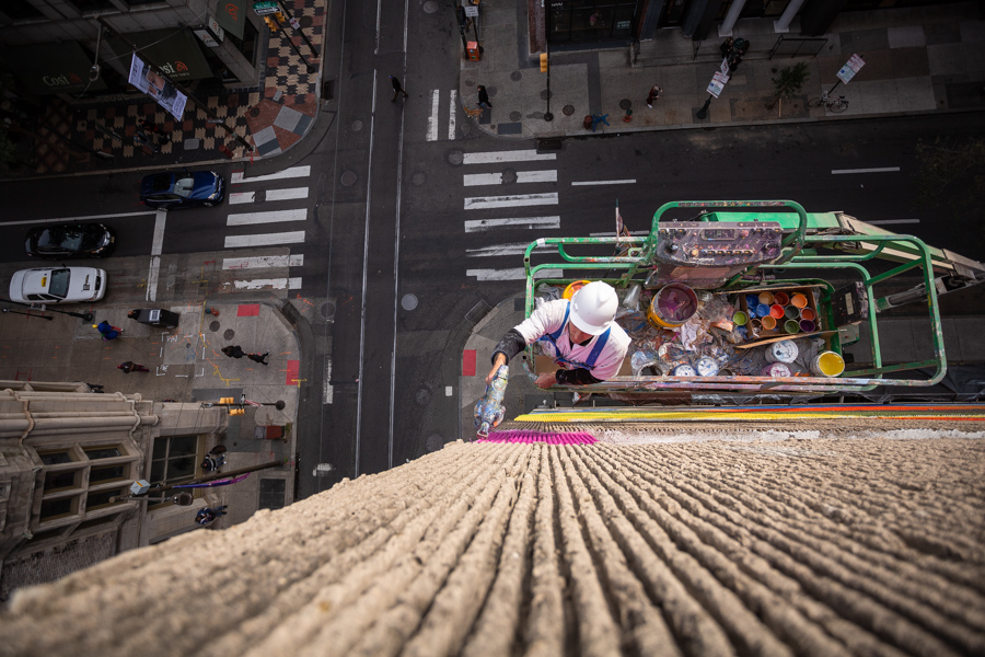 Join us in celebrating this innovative project from artists Brad Carney and Michael Konrad. Their signature colorful styles reach new heights as bright geometrical shapes and 37 painted metal panels climb the exterior wall of the Midtown Village Parkway Corporation parking garage, seamlessly flowing from one level to the next.
