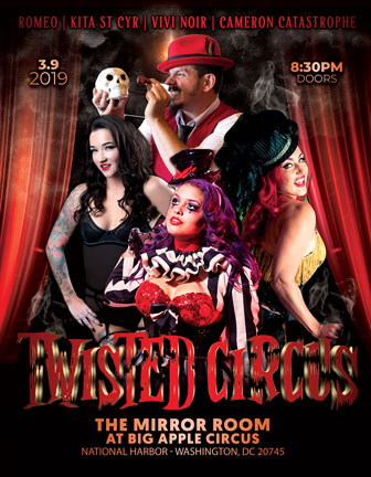 Join Twisted Circus on the DC stop of their spring tour for a night of sideshow, magic, and more at Big Apple Circus’s Mirror Room on Saturday, March 9, 2019 at 9:00 p.m. after the 7 p.m. show. With jaw-dropping performances by Romeo (Producer of Twisted Circus), Vivi Noir (Winner 2015 Golden Legends Championship Challenge), Cameron Catastrophe (The Darling Diva of Danger) and more, this is a show you don’t want to miss!