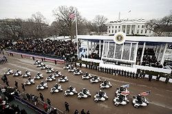 The Swearing-in ceremony takes place on the West Front of the U.S. Capitol with the president-elect being sworn-in by 12 noon on January 20. Amendment XX to the U.S. Constitution states that the term of the President expires at noon on January 20. The Inaugural Parade on Pennsylvania Avenue passes the Presidential reviewing stand in front of the White House.